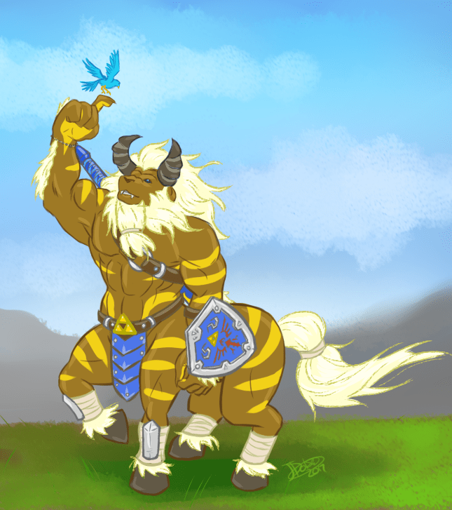 Anyway, went with the Gold Lynel colors because I felt they’d look better with the Hylian blue. The bracelet on his hand is called “Zelda’s Trinket” and allows him access to the castle. He’s actually one of the Hylian Royal Guard, but he doesn’t fit into the human-sized areas well. He’s very gentle with smaller beings, and has on more than one occasion been a mount for someone. He’s quite loving with those he’s friends with, and can be counted on for hugs whenever asked.